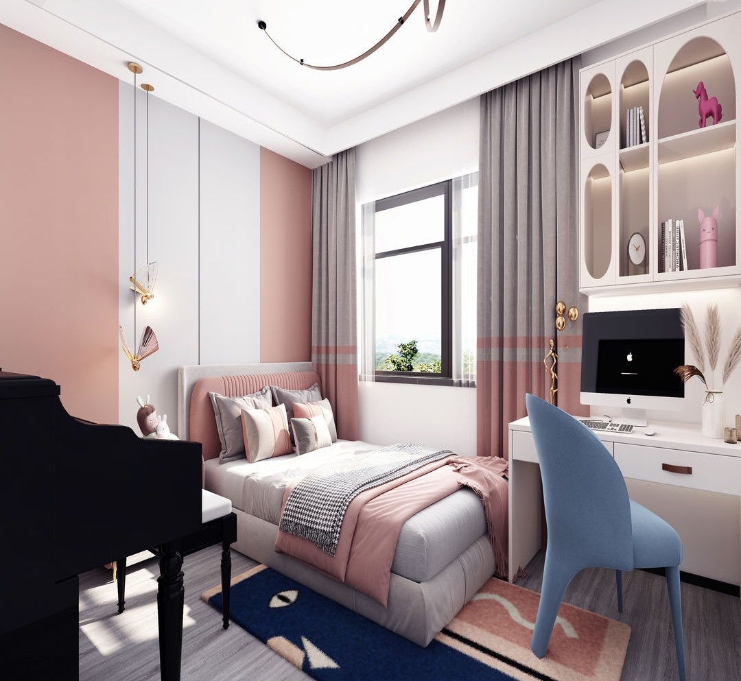 眼睛是孩子認(rèn)識世界的窗戶,顏色是組成世界的重要元素。兒童房以粉白兩色為基調(diào),灰粉色窗簾的點綴,符合小女孩的天性。
