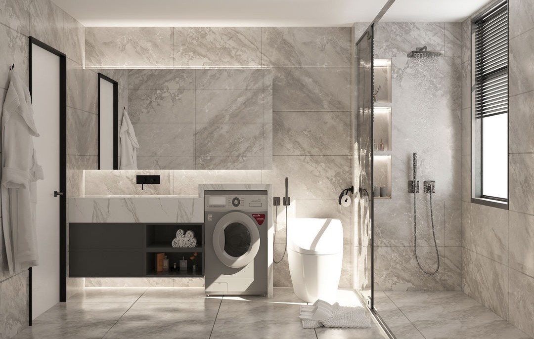衛(wèi)生間設(shè)干濕分區(qū),墻體增加壁龕設(shè)計,兼顧收納與裝飾:洗手臺裝全境面體,可大大提升空間直視感,下方加裝儲物柜,更多收納空間。柜體與地面保持了一定距離,方便清掃還防潮。