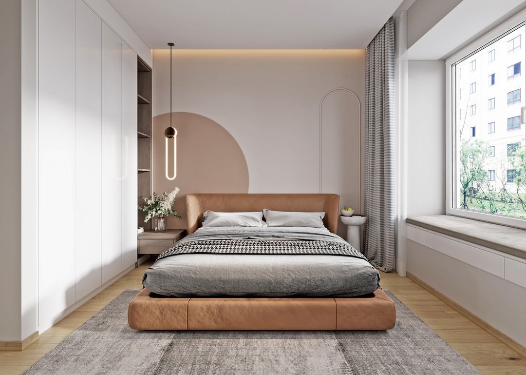 靜謐簡(jiǎn)約又溫馨的奶茶色主臥。床頭簡(jiǎn)簡(jiǎn)單單的淺色硬包設(shè)計(jì),搭配原木色地板干凈又自然,特別能烘托出軟裝的設(shè)計(jì)感。棕色頭層牛皮床,搭配奶咖色床頭背景墻,白色通頂柜體,整體色系過渡自然又溫馨~