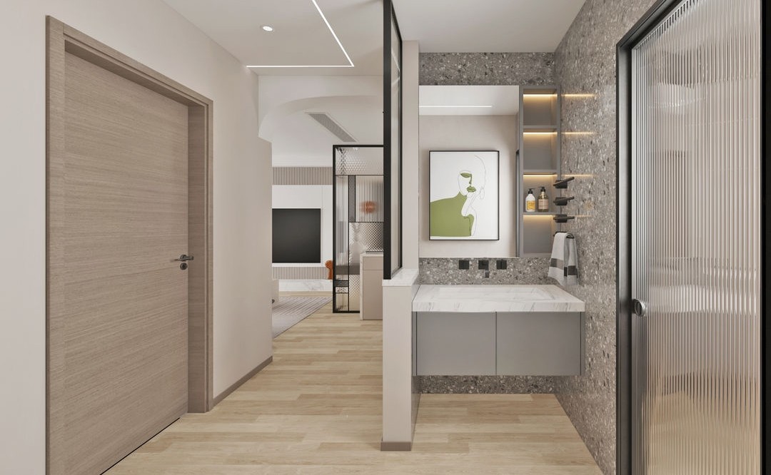 衛(wèi)生間采用干濕分離,把衛(wèi)生間一分為二,干區(qū)濕區(qū)可以同時(shí)使用,還可以延長(zhǎng)木質(zhì)柜體的使用壽命,水磨石磚搭配長(zhǎng)宏玻璃隔斷,***感和清新感結(jié)合的恰到好處。