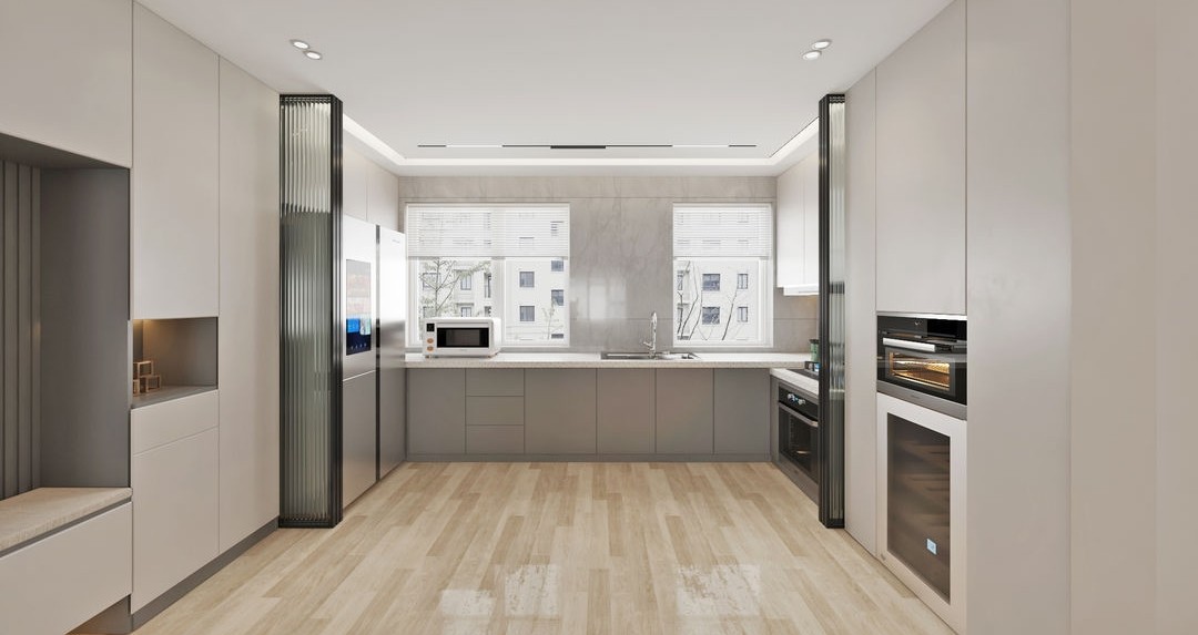 廚房空間足夠大,U型布局是不錯(cuò)的選擇,空間得到充分利用。定制的低飽和度的柜體,整體看上去整潔干凈又***,茶色玻璃柜門也是個(gè)提高顏值的不錯(cuò)選擇。