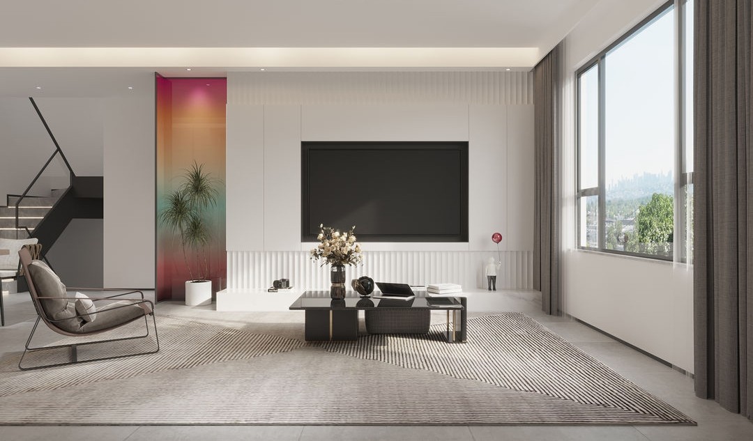 客廳整體以淺色為空間基調(diào),結(jié)合現(xiàn)代的簡(jiǎn)明線條勾勒以及精致的烤漆玻璃,隨著陽光的逐漸灑落,黑白灰極簡(jiǎn)的空間中躍出一抹明晰的彩色,室內(nèi)越發(fā)清簡(jiǎn)而開闊。