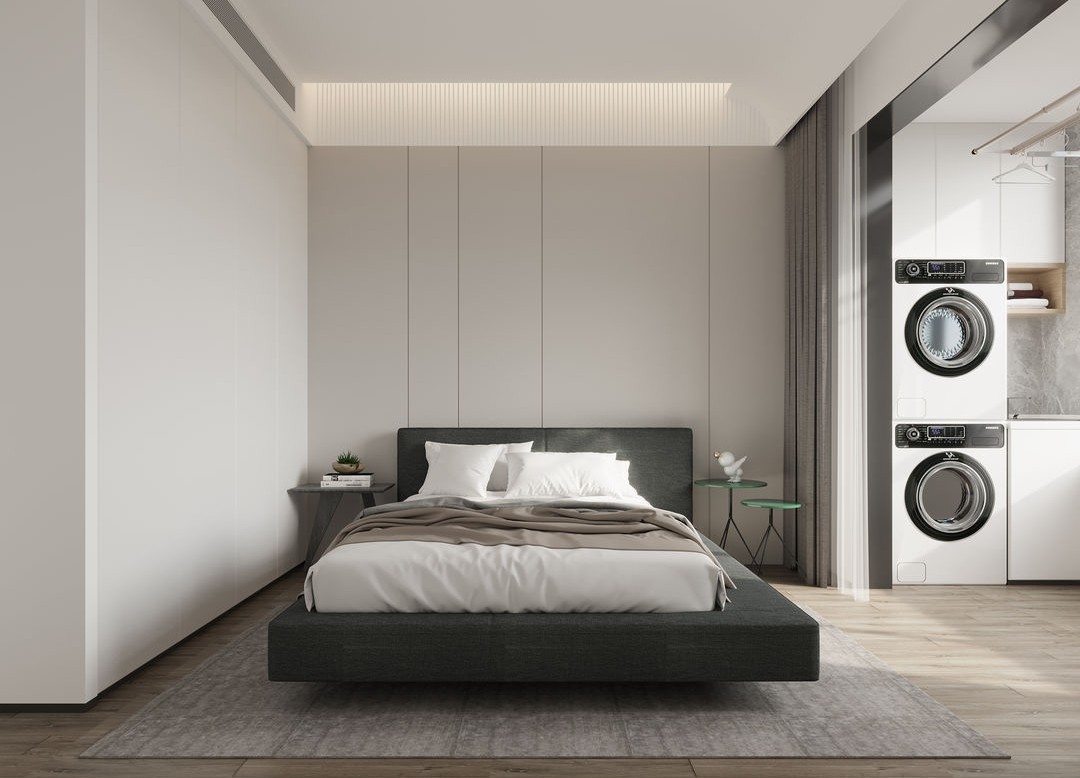 主臥保持全屋的統(tǒng)一基調(diào),淺色系打底,卡其灰色護(hù)墻板配以灰綠色的布藝柔軟大床 ,大氣又不失溫馨。