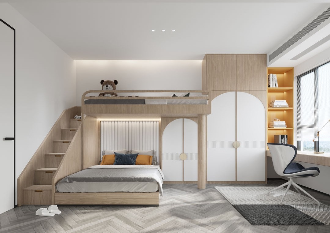利用垂直空間做了錯(cuò)位上下床,下方是睡眠區(qū),上方以及其余空間都是孩子的活動(dòng)區(qū),學(xué)習(xí)區(qū)。到頂衣柜,樓梯柜滿足日常的收納使用。充分利用空間,既實(shí)用又有趣味性。