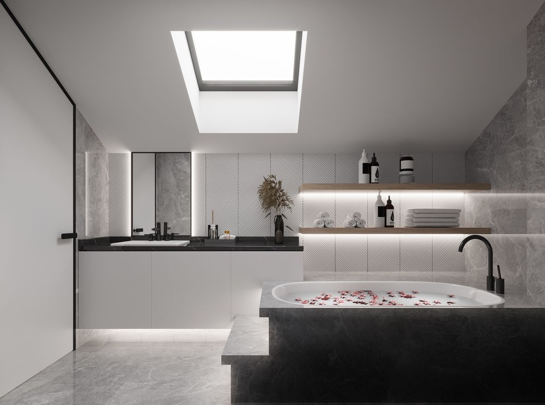 衛(wèi)生間采用嵌入式的浴缸,自己砌的臺(tái)面,上面連接著洗手臺(tái),雙層置物架,取放方便。屋頂?shù)奶齑?,既保障了采光,又無需擔(dān)心隱私問題。閑暇時(shí)美美的泡個(gè)花瓣澡,生活簡(jiǎn)直太美好。
