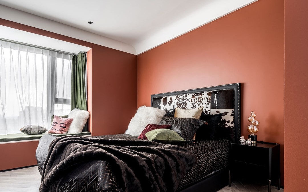 主臥的色調(diào)延續(xù)了紅色的熱情與濃烈,張揚(yáng)而性感的同時(shí),又在不經(jīng)意間流露著自信與活力。黑白皮革拼接的床頭,創(chuàng)造出大膽而鮮明的視覺效果。