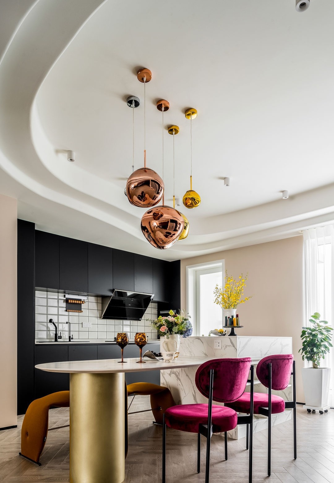 將原有的空間打破,融合重組之后,開放了原來狹小的廚房,將它與餐廳的空間合二為一。以中廚、西廚、餐廳混合空間的形式呈現(xiàn)出來,***限度地實(shí)現(xiàn)了廚房電器及餐具的收納。