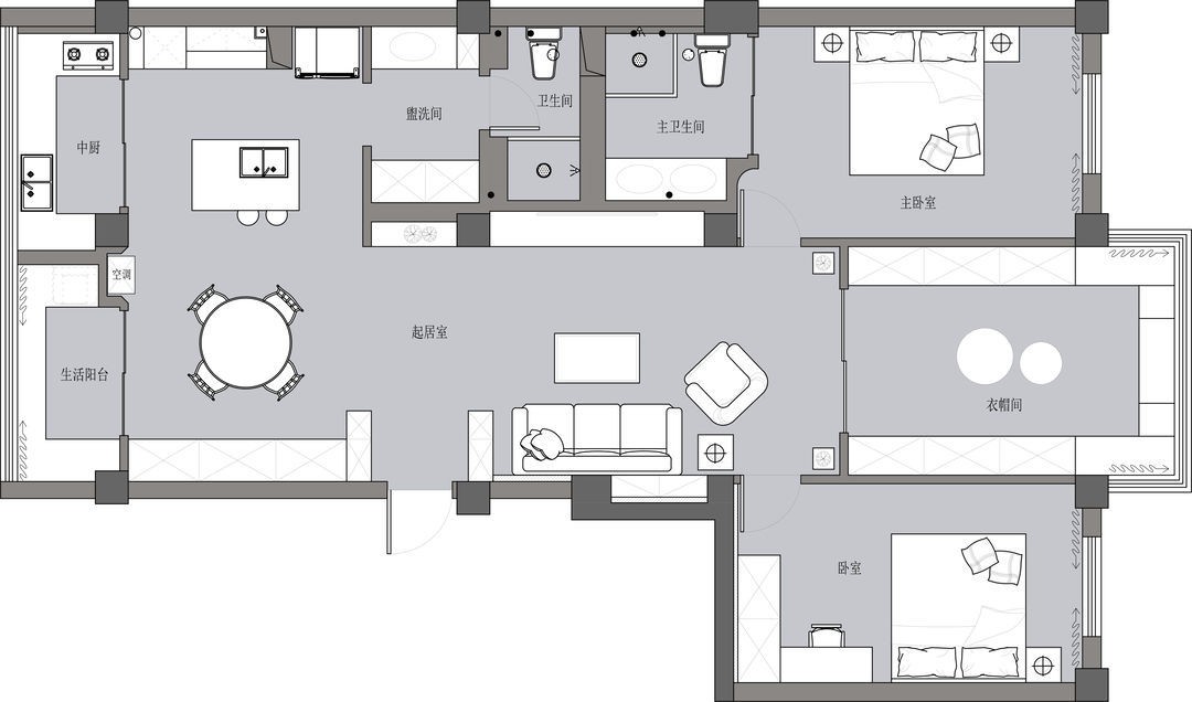 客廳是夫妻二人日常呆的最多的地方,需要盡可能的明亮寬敞舒服。調(diào)整過戶型之后,客廳比原來寬敞了不少,也符合業(yè)主的無主燈的要求。