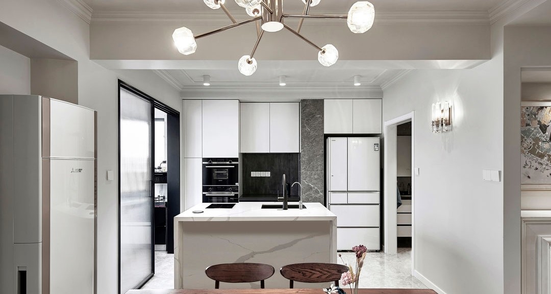 餐廳和西廚用島臺隔開,西廚、餐廳和客廳連通一體,視覺體驗更加開闊。為了節(jié)省空間,墻體內(nèi)凹放置立式空調(diào)。因為空調(diào)進(jìn)出風(fēng)口位于兩側(cè),特意做了斜面的設(shè)計方便空氣流通。