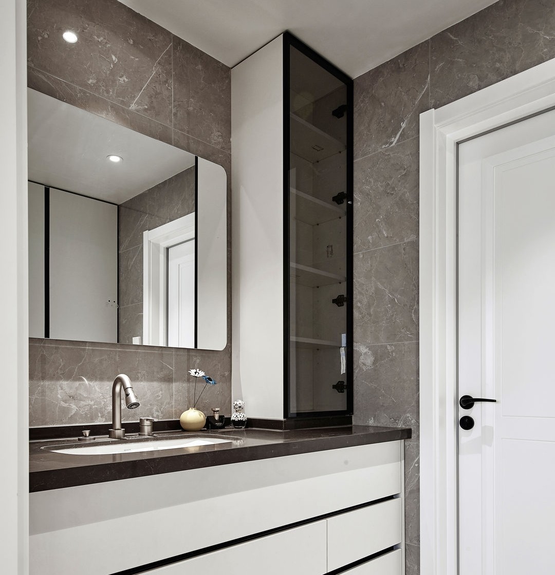 客衛(wèi)門套的位置以冰箱的寬度為準(zhǔn),讓冰箱看起來完美內(nèi)嵌在墻體柜子之間。洗手盆跟馬桶淋浴分離,完成了業(yè)主想要做干濕分離的需求。