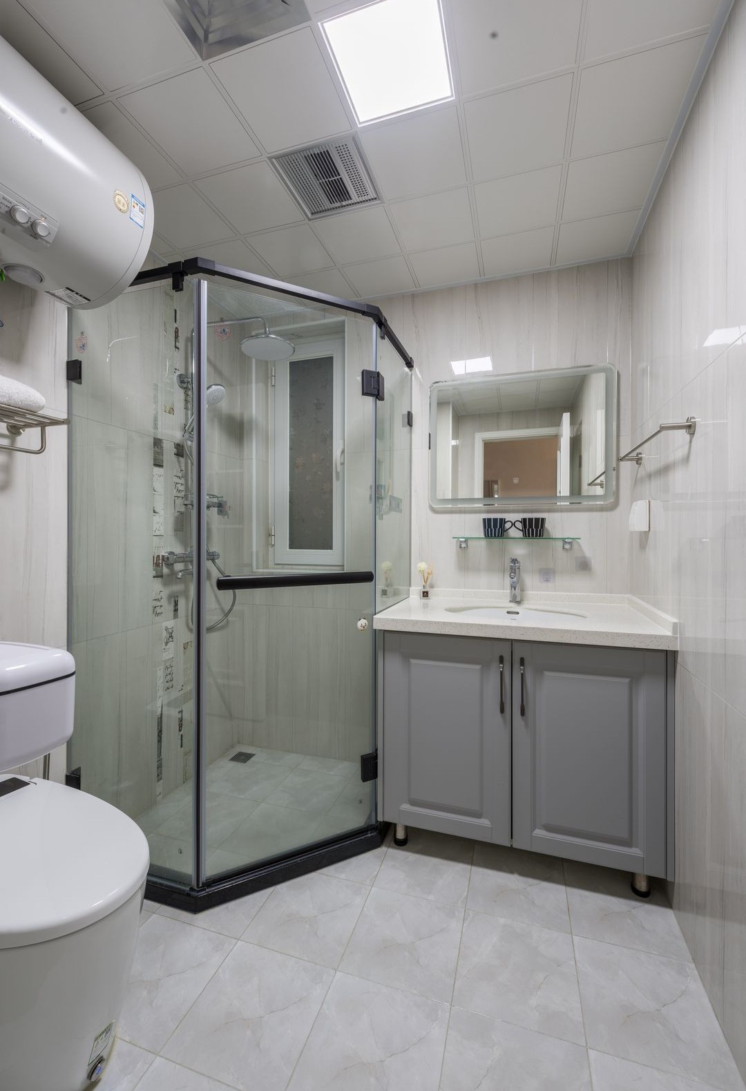 衛(wèi)生間墻面鋪貼大尺寸的素紋白色瓷磚,地面采用大理石紋款式,極力放大視覺空間,讓衛(wèi)生間更顯通透、明亮。濕區(qū)以玻璃淋浴房做隔斷,實(shí)現(xiàn)干濕分離,灰色小腳浴室柜支撐柜體懸空,避免柜體受潮發(fā)霉。