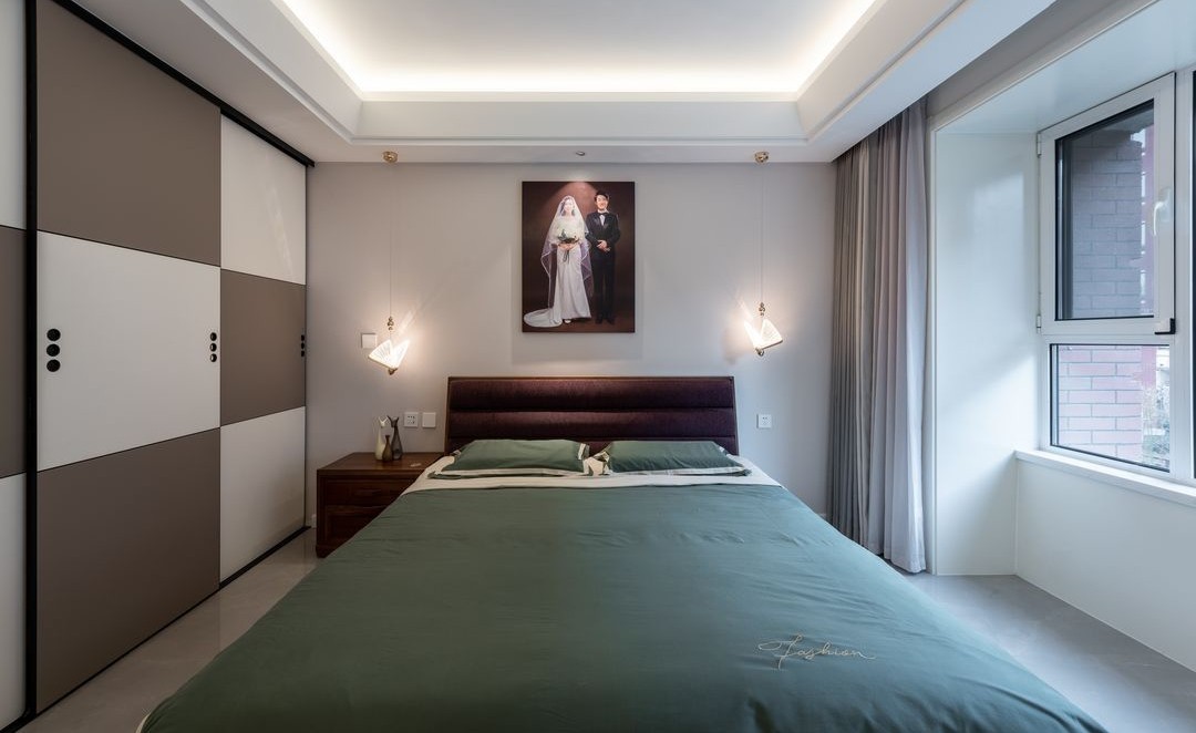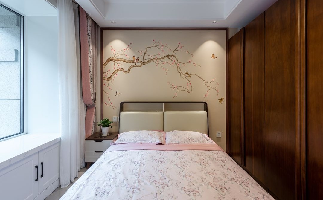 長(zhǎng)輩臥室沉穩(wěn)而不壓抑,實(shí)木的衣柜似經(jīng)過(guò)歲月洗禮的長(zhǎng)輩,漫漫歲月,愈發(fā)穩(wěn)重豁達(dá)。背景墻上的“喜上眉梢”,不僅具有觀賞性,更寓意高雅。