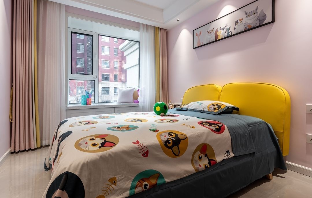 兒童臥室,童趣滿滿,活力十足。明黃色的床靠背,賦予房間滿滿能量,輕快明亮。床上用品和床頭畫(huà)選用了多彩的貓貓圖案,趣意盎然。墻面涂料與窗簾都選用粉色,勾織出天真爛漫的模樣!