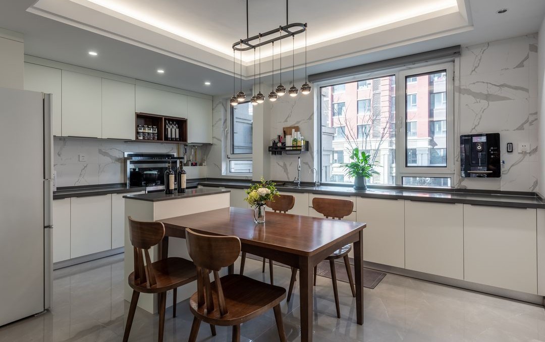 餐廚一體,整體簡(jiǎn)潔舒爽。這樣的設(shè)計(jì),使空間開(kāi)闊明朗,更方便了家人之間的交流,讓愛(ài)與美味,哪一個(gè)都不會(huì)缺席,而且與老家具的配套使用***大方,不落俗套。