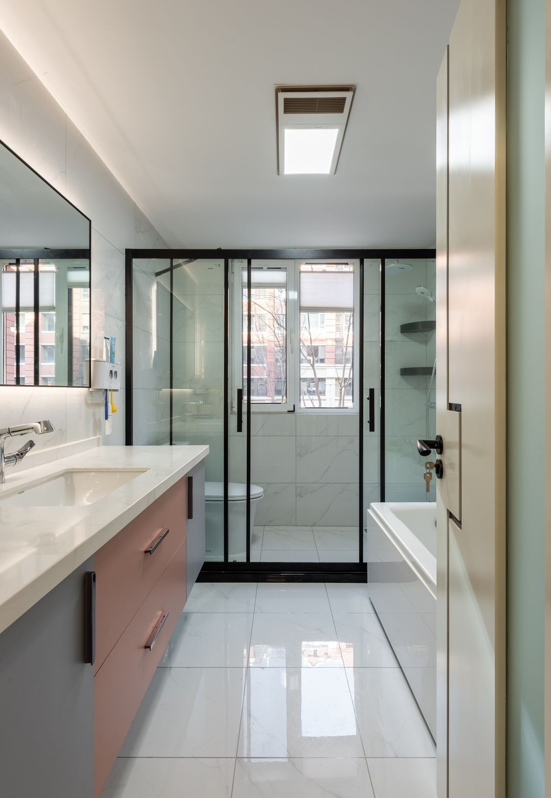主衛(wèi)粉色藍(lán)色相拼,潔凈清新。淋浴頭、浴缸雙設(shè)置,功能齊全。黑色的把手和框架起到分隔的作用,同時(shí)與其他顏色起到強(qiáng)烈的視覺(jué)沖擊