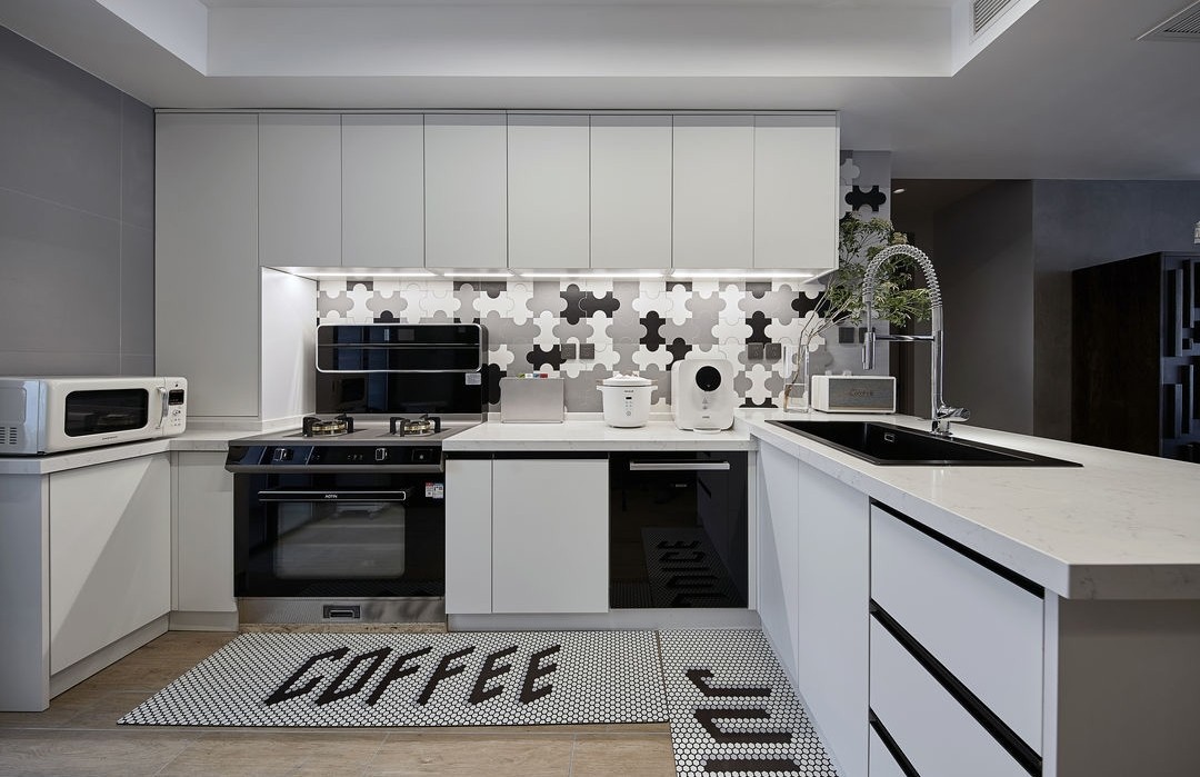 開放式廚房選用仿地板瓷磚便于清理,瓷磚與地板之間選用極窄的T型壓條,同樣的無主燈設(shè)計(jì),弱化了不同區(qū)域的差異感。吧凳與餐廳家具風(fēng)格保持一致,讓兩個(gè)空間通過島臺形成良好互動(dòng)。