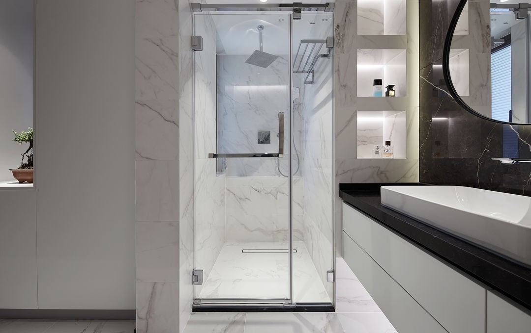 合二為一后的衛(wèi)生間寬闊許多,干濕功能分離、功能劃分清晰。整體的黑白配色干凈清透,大理石紋路的柔光瓷磚讓空間柔和自然。壁龕內(nèi)藏線性燈,讓家里的瓶瓶罐罐充滿了炫酷色彩。