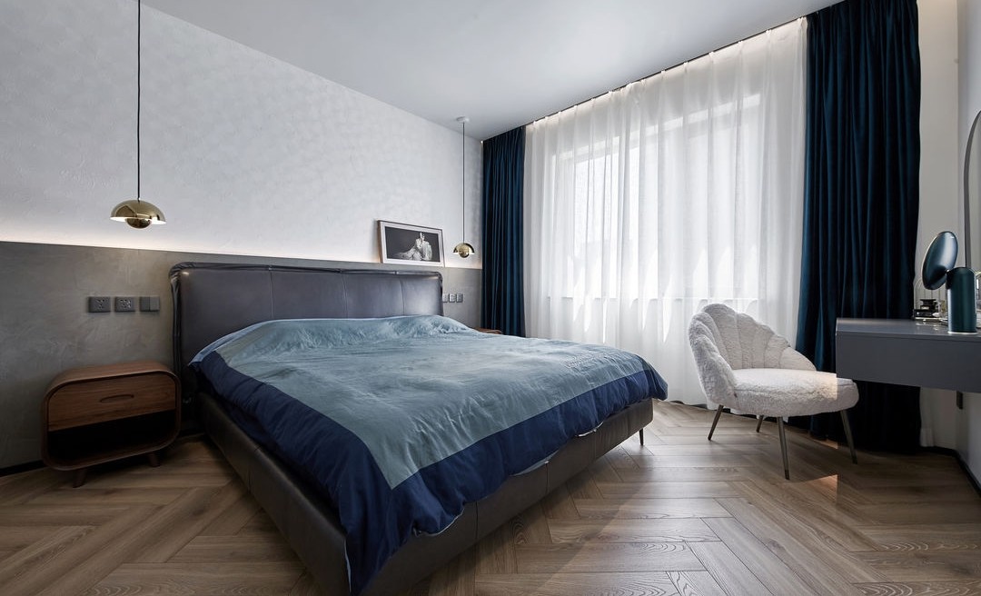 主臥室延續(xù)了整體黑白灰的顏色和質(zhì)感。同時(shí)在更小的空間讓燈光層次豐富而不炫目。水泥肌理和白色肌理的墻面讓簡單的顏色擁有了豐富的內(nèi)容,燈的開關(guān)和插座也是同一個(gè)顏色體系中的一部分。