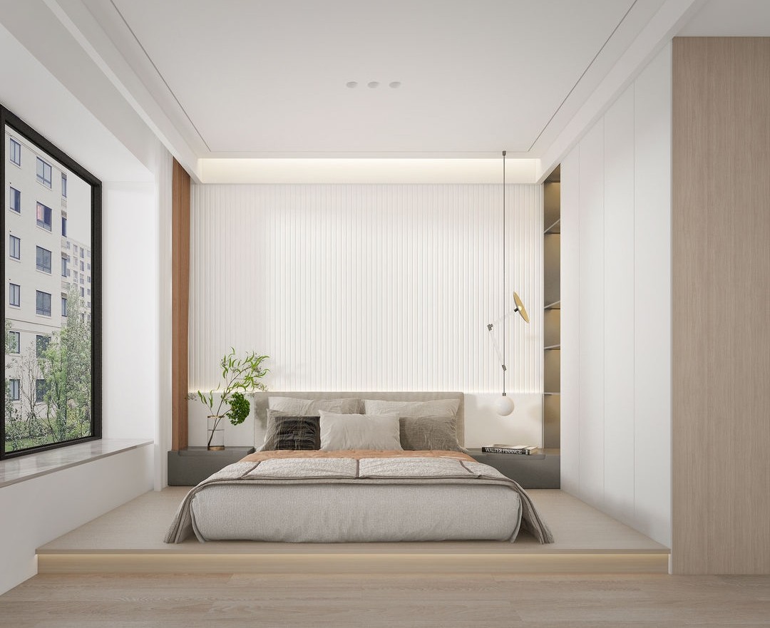 溫馨***的主臥,真是想讓人宅出整個世界~整體色調(diào)采用暖中性色系,通頂衣柜是無把手彈跳門的設計,一排開放柜體的小細節(jié)提升整體空間的質(zhì)感。床頭背景墻采用格柵板裝飾,配色符合整體空間的色系~格柵板的材質(zhì)撐起整個空間線條感。