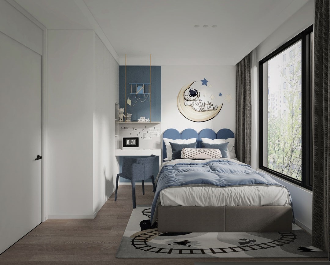 炫酷的太空主題兒童房,整體色調(diào)選用灰藍色搭配白色,靜謐中帶著點活潑的感覺。白色通頂柜體儲物空間足夠的同時,還設計了連通書桌和開放格的設計,不僅可以收納還兼顧了展示的功能~胡桃木色的地板搭配一塊童趣十足的地毯,便是孩子自由玩耍的空間~