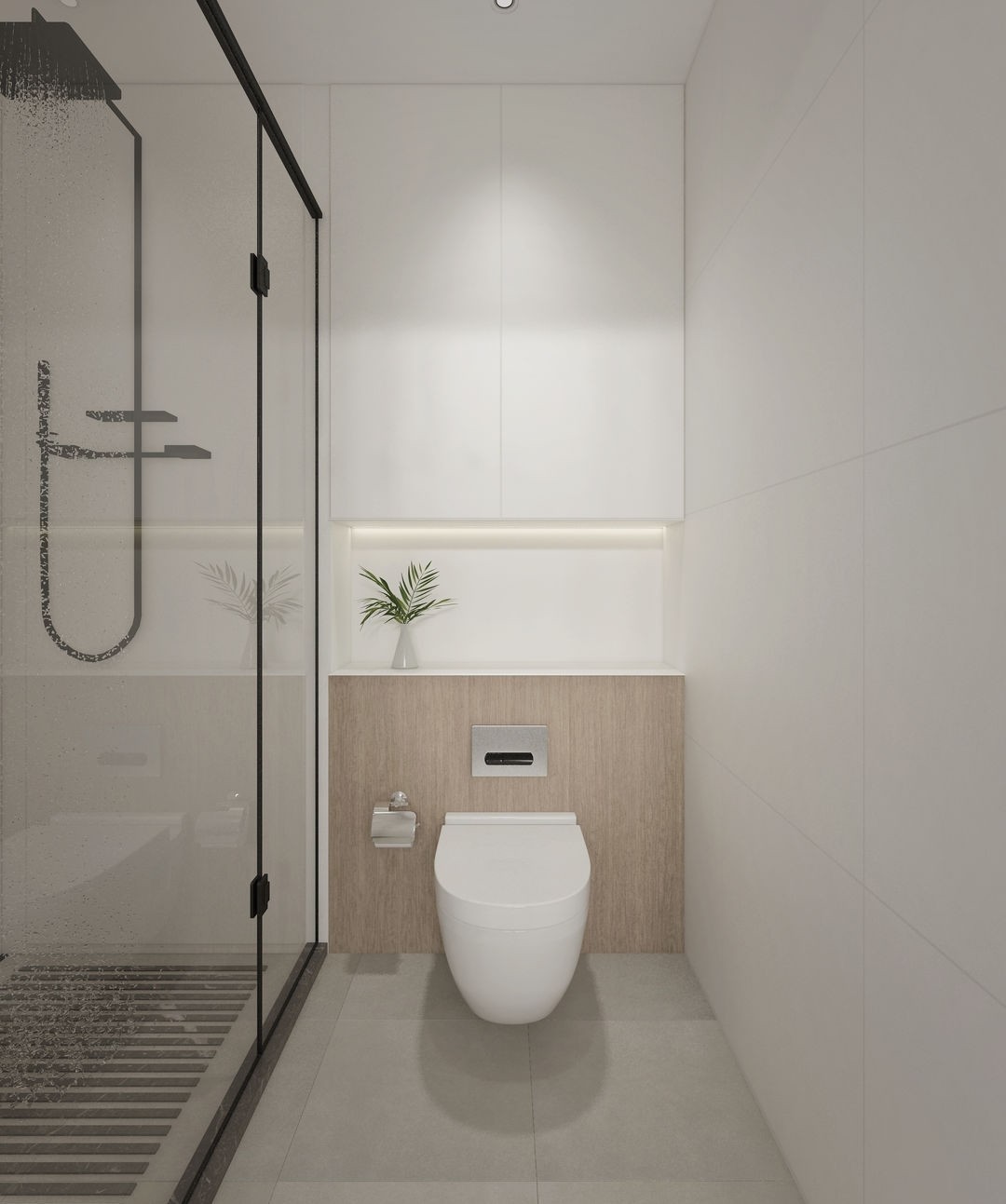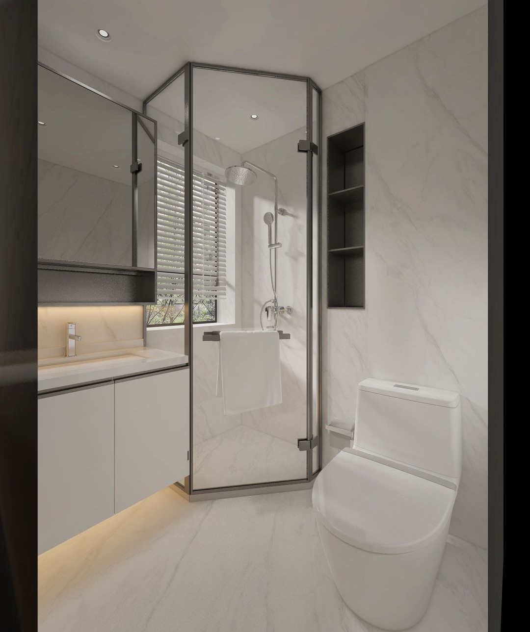 主臥衛(wèi)生間設置干濕分區(qū),墻體增加壁龕設計,兼顧收納與裝飾,洗手臺裝全鏡面,可大大提升空間直視感,下方加裝儲物柜,更多收納空間。柜體與地面保持足夠距離,方便清掃還防潮。