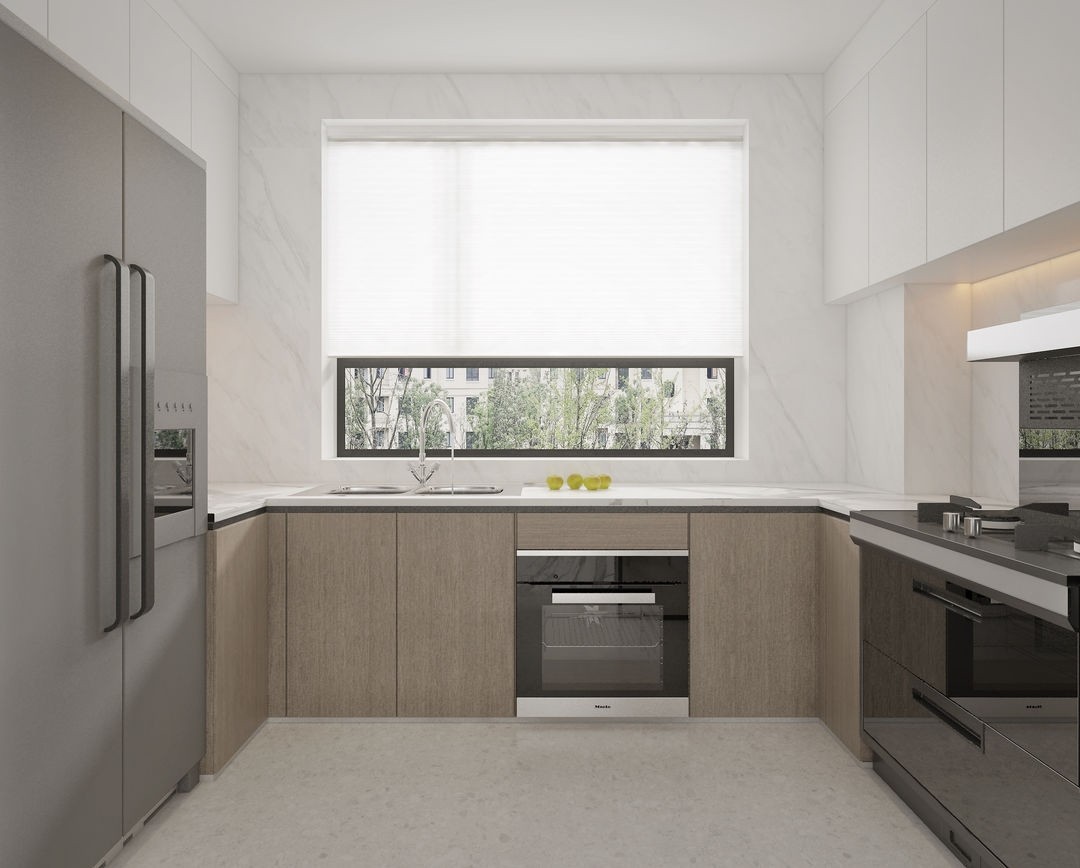 高雅的磨砂白和淺色原木組合的柜面,搭配白色石英石臺面讓整個廚房空間變得更加簡潔、舒適。整個廚房設計將自然光線引入室內(nèi),增加餐廳采光面積,演繹出設計與生活的均衡美??臻g足夠大,U型布局是不錯的選擇,空間得到充分利用。