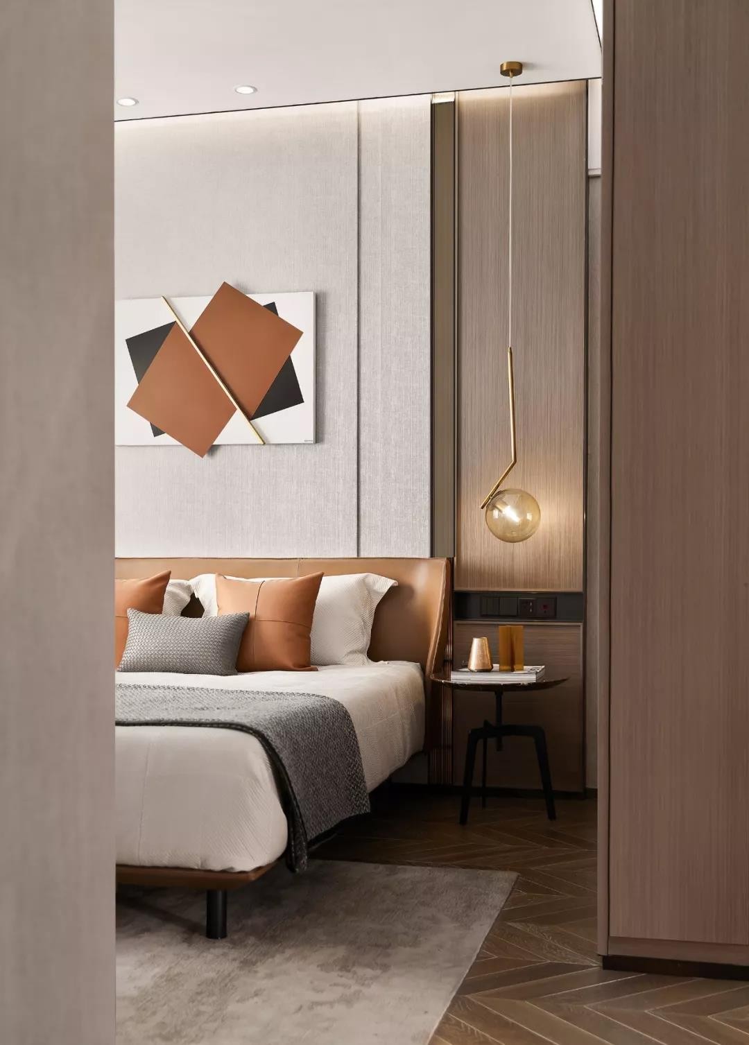 主臥的背景墻以木藝與布藝的材質(zhì)拼接
