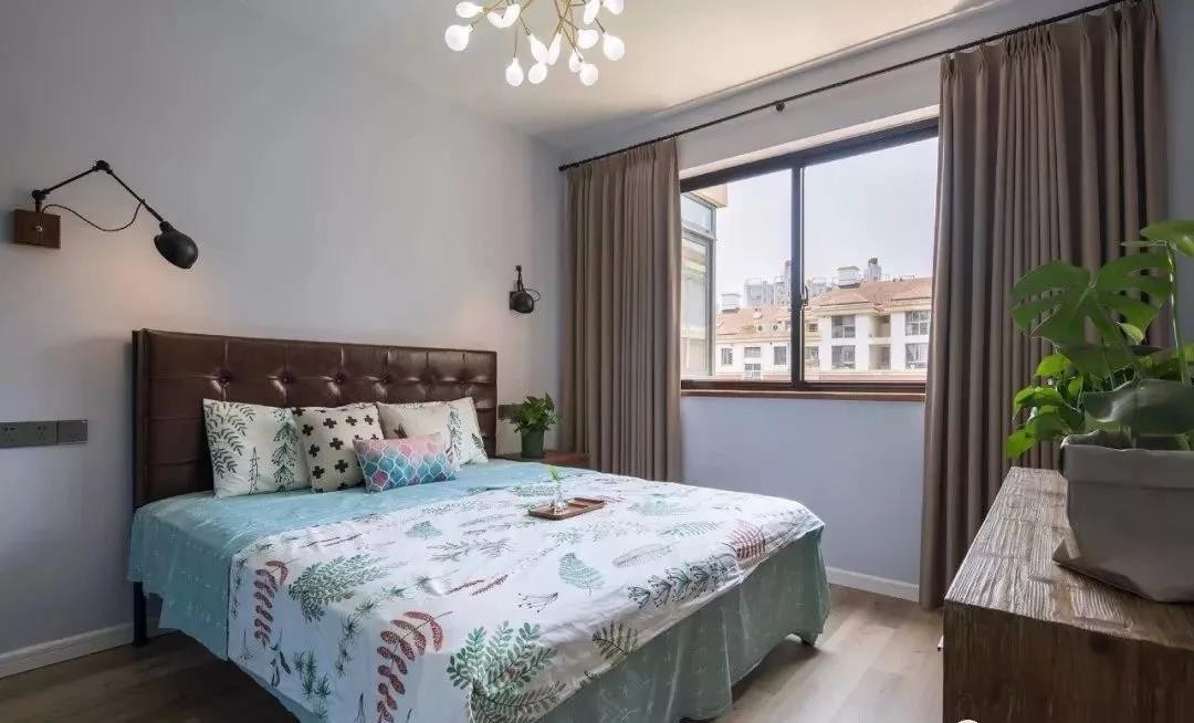 次臥的背景墻刷成了淺藍色,一個皮質靠背的床搭配亮色系的床品,在軟裝和顏色的搭配上都和主臥不同