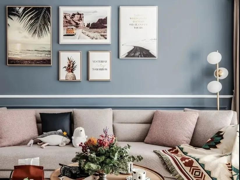 灰藍(lán)色背景墻線條勾勒造型,兩側(cè)點綴不同造型燈飾