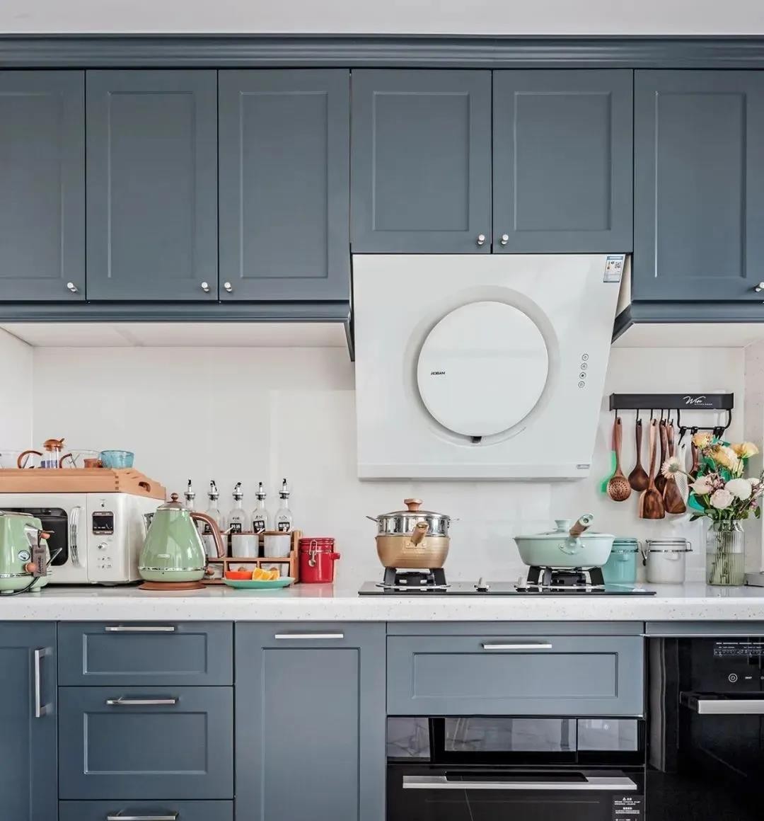 廚房,藍(lán)灰色櫥柜門搭配白色墻磚與臺面,打造干凈清爽的烹飪環(huán)境