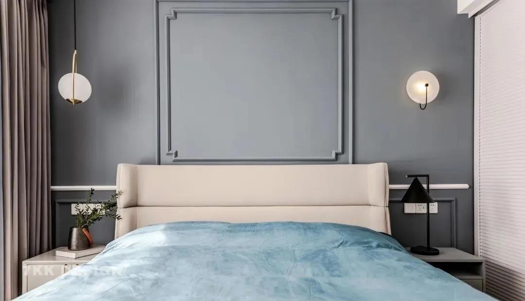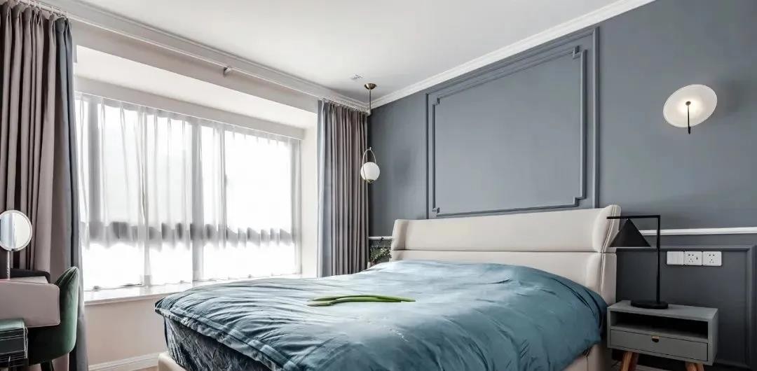 主臥以不同深度的藍(lán)色搭配白色調(diào),營造出靜謐又溫馨的氛圍