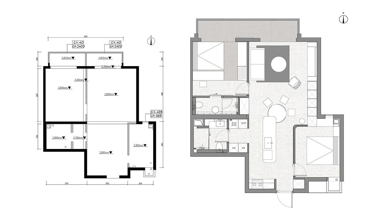 專為孩子上學(xué)購置,父母希望在這里為孩子營造盡可能好的學(xué)習(xí)及居住狀態(tài),一居擴(kuò)改二居是核心需求。夫妻二人的氣質(zhì)非常明確:開朗、善談、明理;讀小學(xué)的孩子愛書法和手工,家庭關(guān)系平等且融洽。一家三口只有周一到周五留宿在此,其他時(shí)間去另外居所,一日三餐只有早上在家簡食。這意味著這兒可以是一個(gè)輕松自由的房子:收納負(fù)擔(dān)較少,對廚房的利用率較低,在設(shè)計(jì)呈現(xiàn)上將和剛需居所有所不同。全家人的審美趣味幾乎一致,不追隨流行