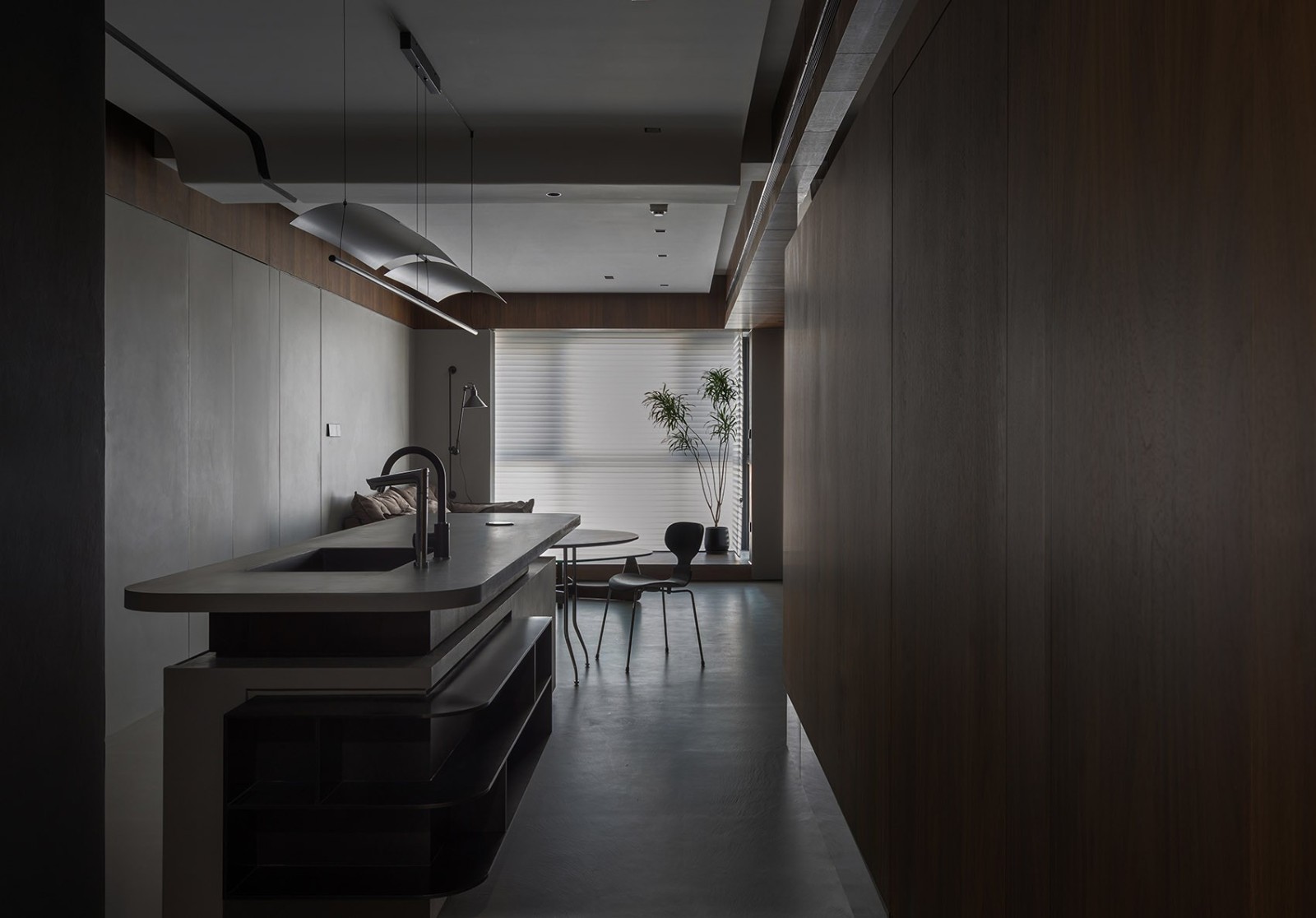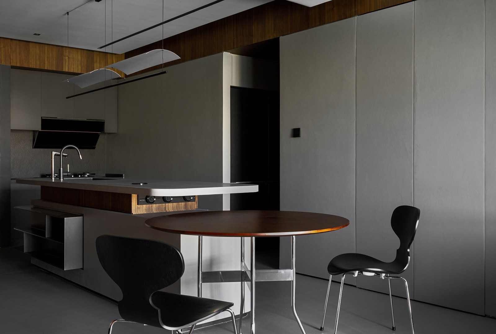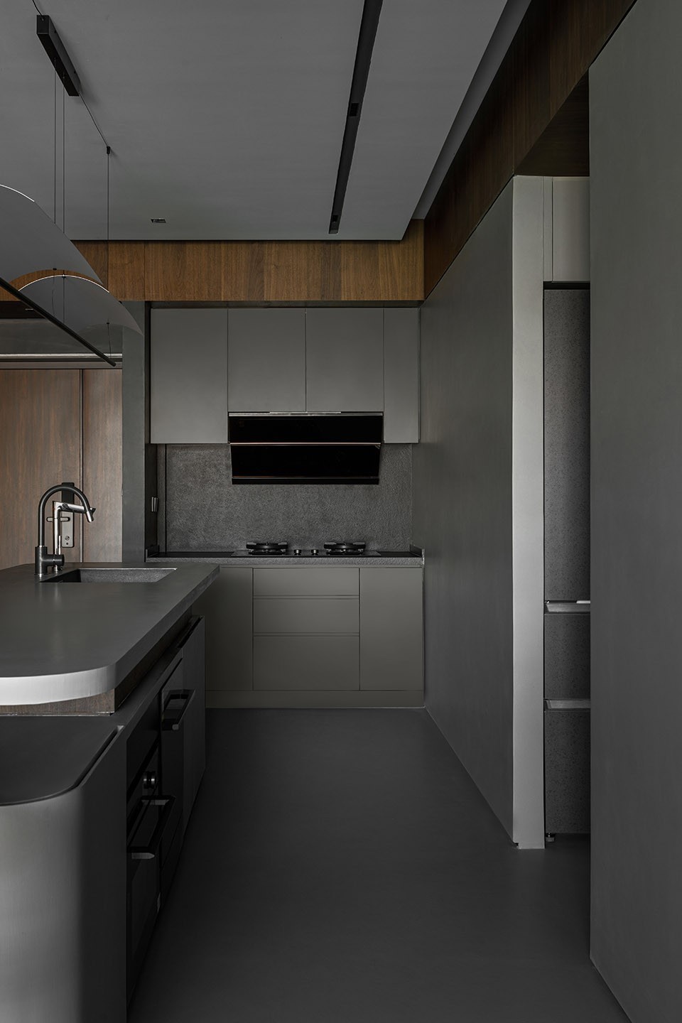 功能劃分上,舍棄原本獨(dú)立廚房,成就獨(dú)立臥房,隨之而來的課題是完善廚房功能。進(jìn)門***段是長島臺,綜合了洗手池、洗碗機(jī)、儲物柜、電源等功能,既滿足業(yè)主對島臺的需求,也串聯(lián)了兩個(gè)臥房,形成自由的環(huán)繞動線。搭接在島臺上的餐桌位于房屋中心,貼合中國人家的生活習(xí)慣,象征著團(tuán)圓,并且符合餐客聯(lián)動的現(xiàn)代生活方式。島臺選用的材質(zhì)與墻地面統(tǒng)一,餐桌和島臺構(gòu)件的主基調(diào)也是胡桃木色,局部不銹鋼的點(diǎn)綴讓空間硬朗明快。