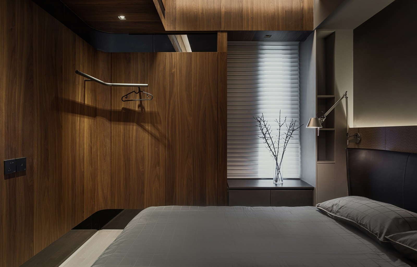 從房間深處看向窗口,被打通的陽臺拓寬了房屋邊界。香格里拉簾具有柔光作用,讓光柔和的作用于窗戶框線和胡桃木,營造溫暖的小木屋氛圍。