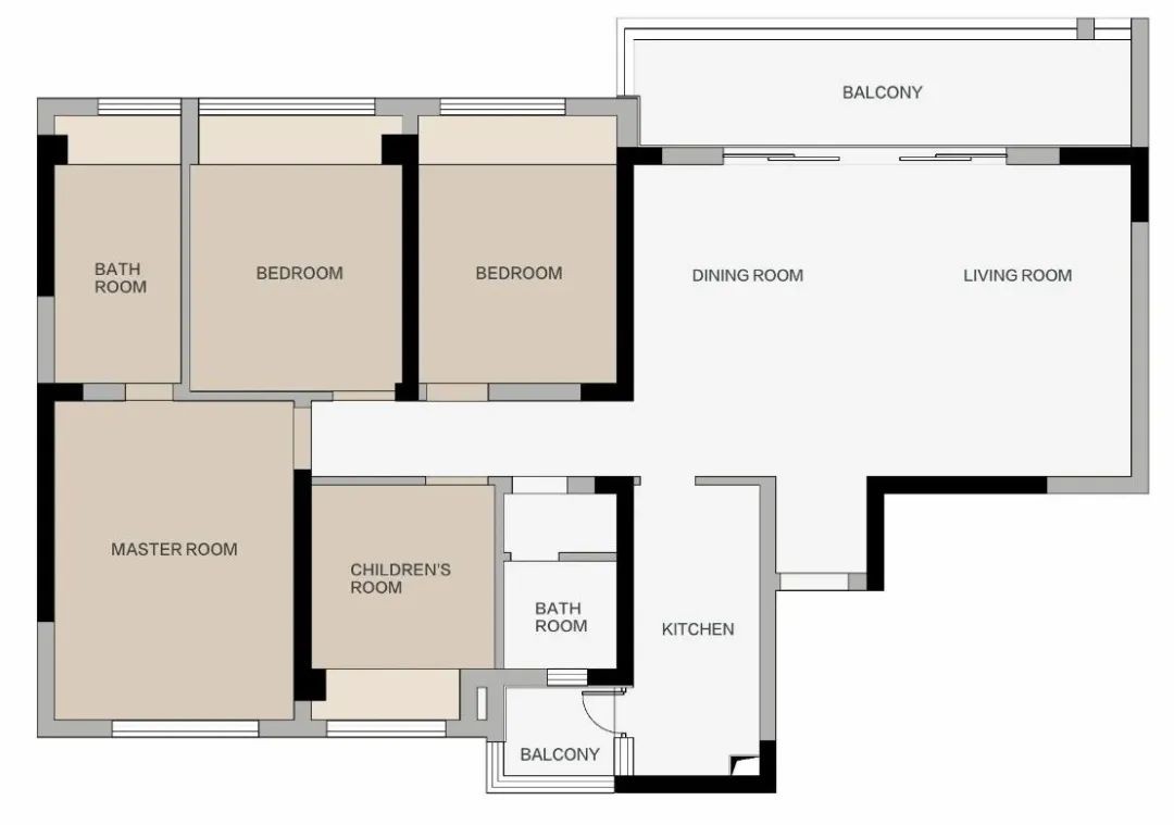 1. 客廳空間推拉門阻隔,采光較差 2. 公區(qū)衛(wèi)生間分區(qū)不合理 3. 原始主臥面積無法滿足套房需求