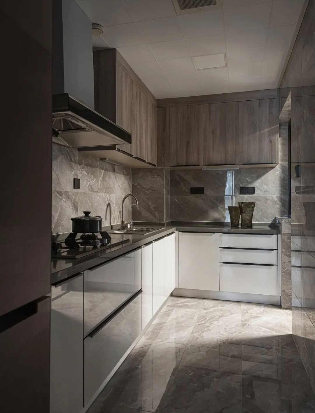廚房沿用客廳的材質(zhì)配色,不同色塊的儲物柜設(shè)計讓空間更靈活有趣。我們將儲物柜盡可能分散到各分段區(qū),以維持臺面無物的整潔感。