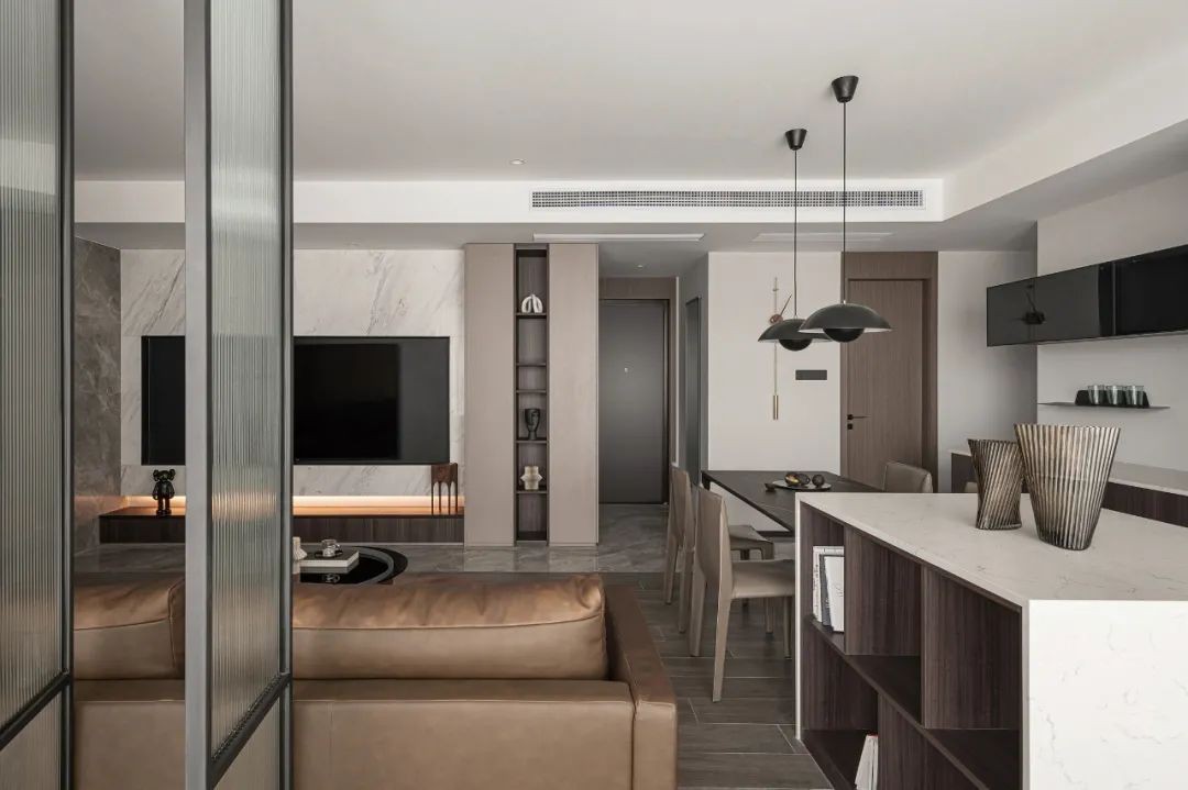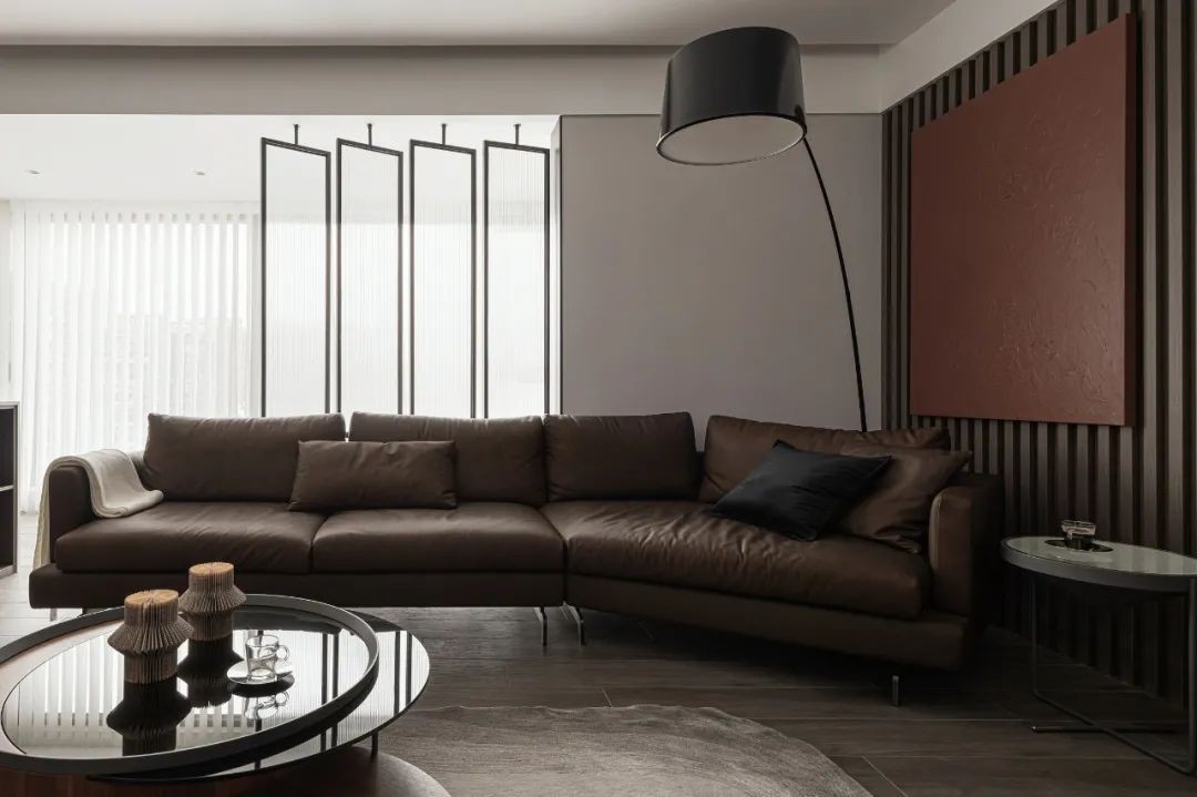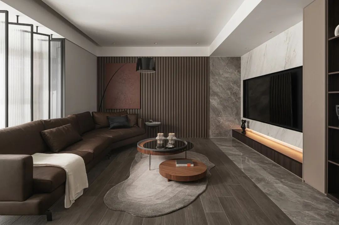 客廳以大地色系為主線呈現(xiàn)出統(tǒng)一的質(zhì)感,以材質(zhì)為界完整切割動線與功能區(qū)。