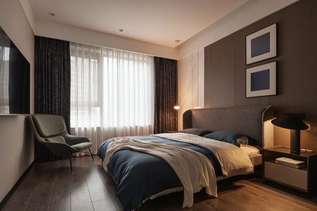 主臥是全屋僅次于客餐廳***的空間,木紋磚、爵士白大理石、木飾面板、金屬線條、棉麻、薄紗、絨面等材質(zhì)被運用得淋漓盡致。