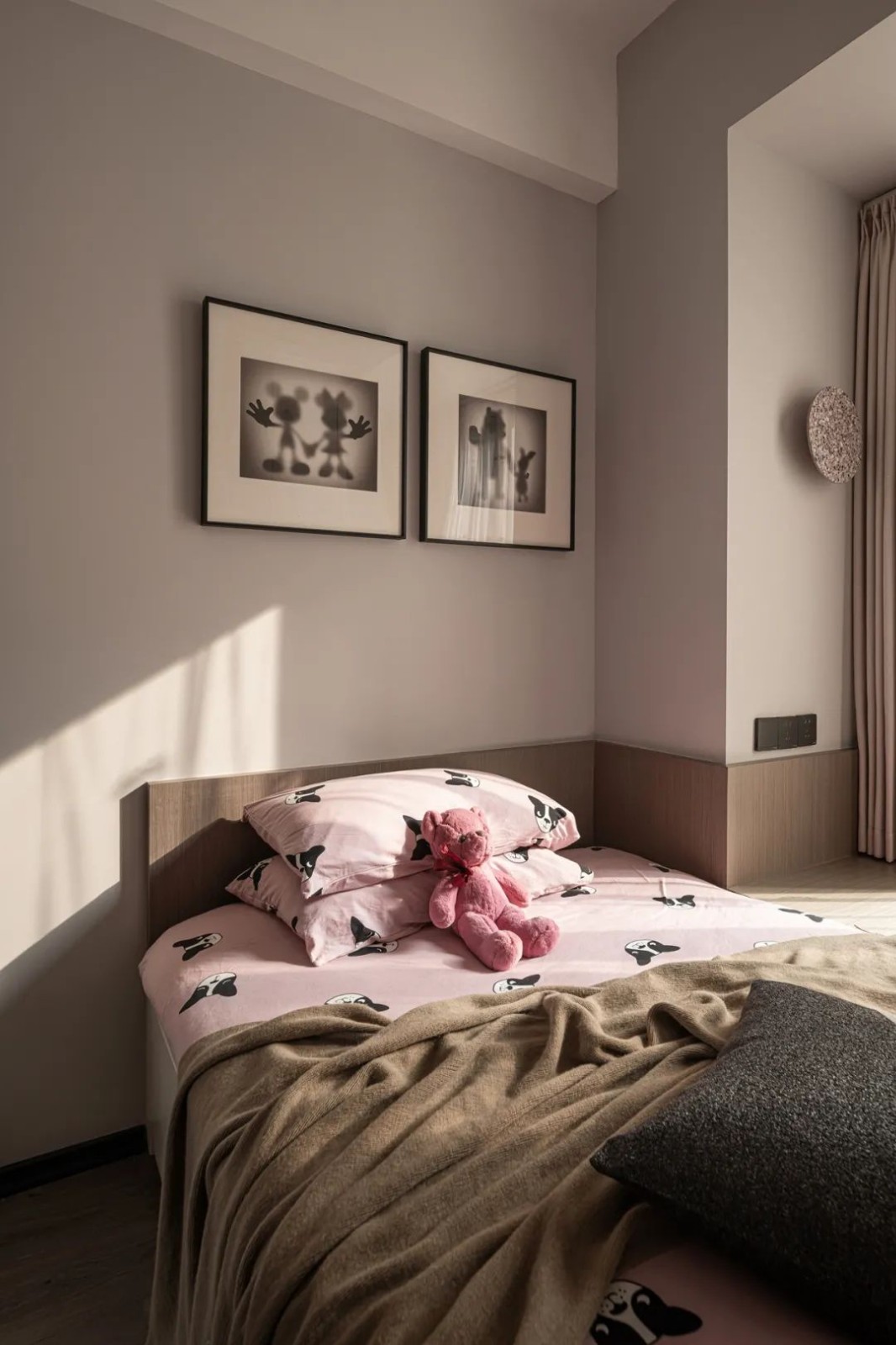 兒童房選用沉穩(wěn)內(nèi)斂的大地色搭配清新怡人的馬卡龍粉。