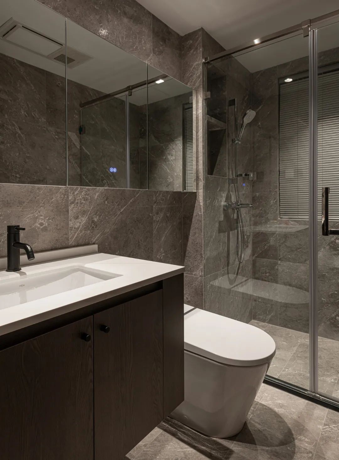 衛(wèi)生間整體以咖色系為主,長鏡面吊柜在滿足儲物空間的同時,橫向拉伸了衛(wèi)生間的空間感。浴室內(nèi)打造壁龕,簡潔實用。