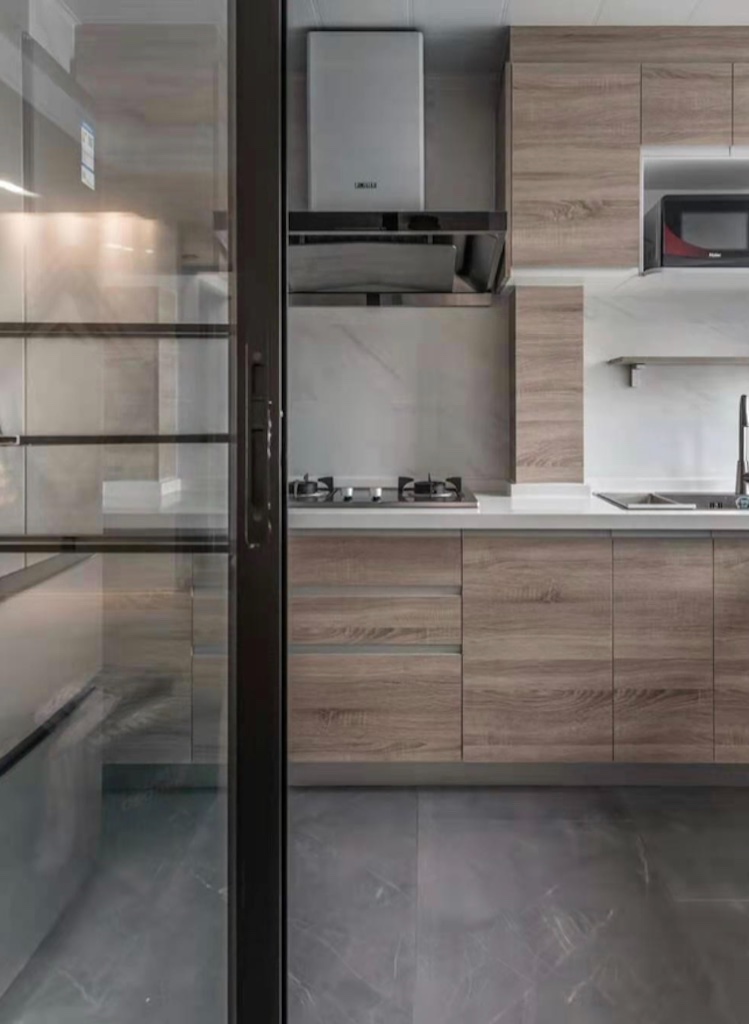 地磚與客廳地磚是同款讓廚房與客廳有個(gè)延續(xù)櫥柜用了吊地柜同色材質(zhì)