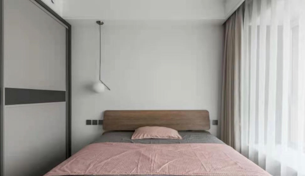 臥室面積有限考慮到色彩對(duì)空間的影響設(shè)計(jì)師特意挑選了接近于灰色乳膠漆墻面的推拉門定制衣柜