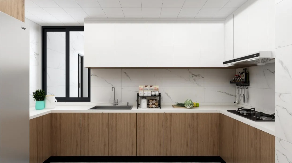 廚房配色為原木色搭配白色,經(jīng)典配色。