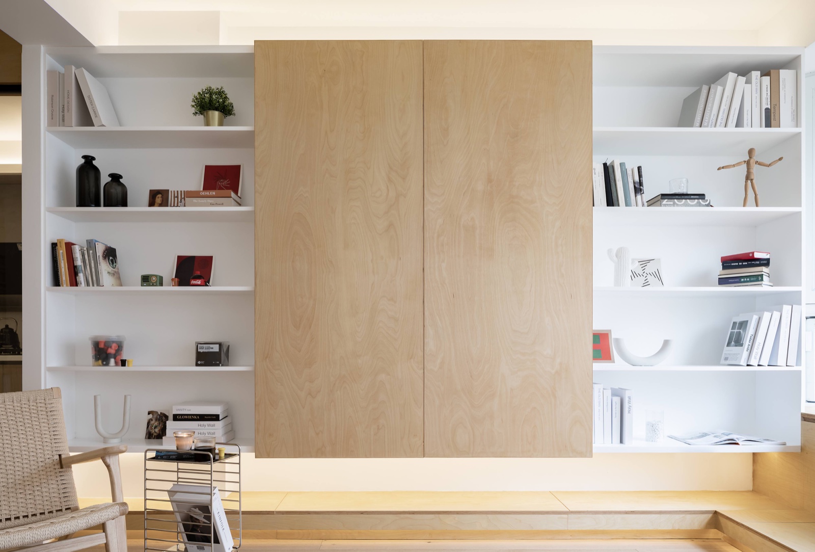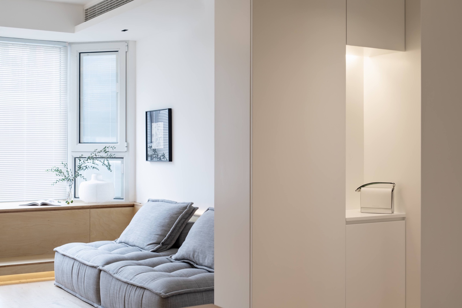 客廳有一整面飄窗,設(shè)計師利用這個窗臺的結(jié)構(gòu)賦予它木的材質(zhì)并增加踏步,兼顧其作為地臺的功能屬性