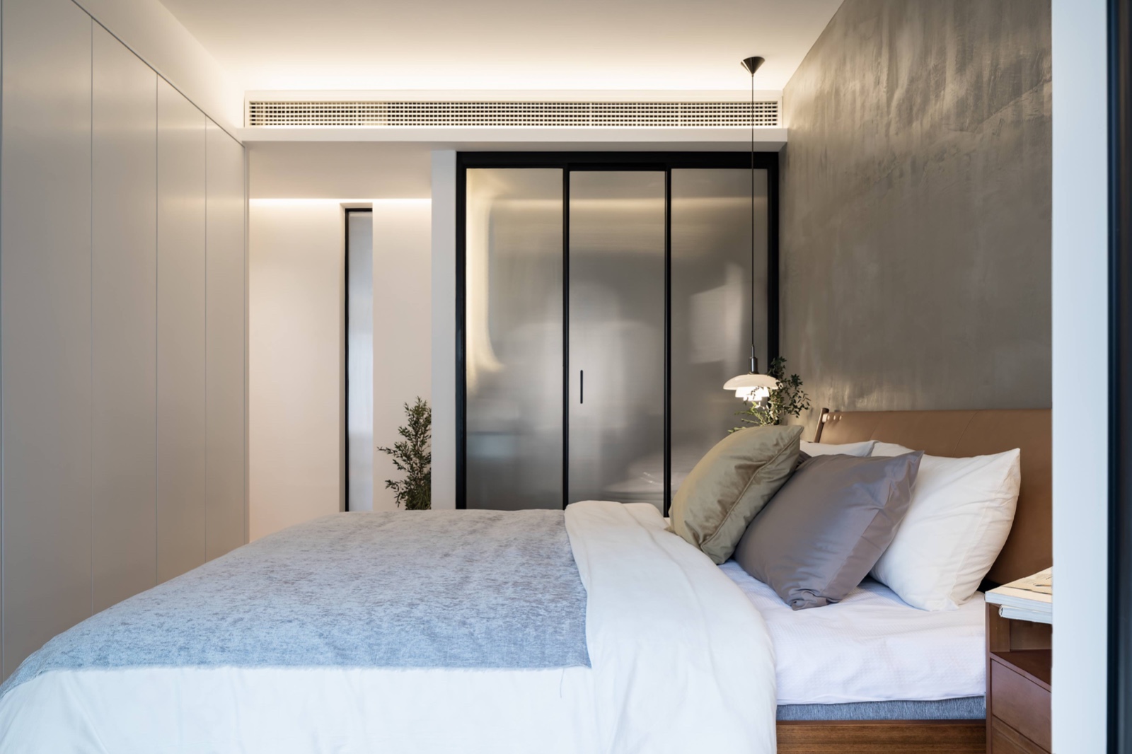 整墻的衣柜保證了衣物收納需求,衣柜底部暗藏?zé)艄?,光的延伸營造出沉浸式氛圍,從而削弱大體量衣柜的平庸厚重感,不但增強(qiáng)視覺層次,還可以作為晚間起夜使用的光源。