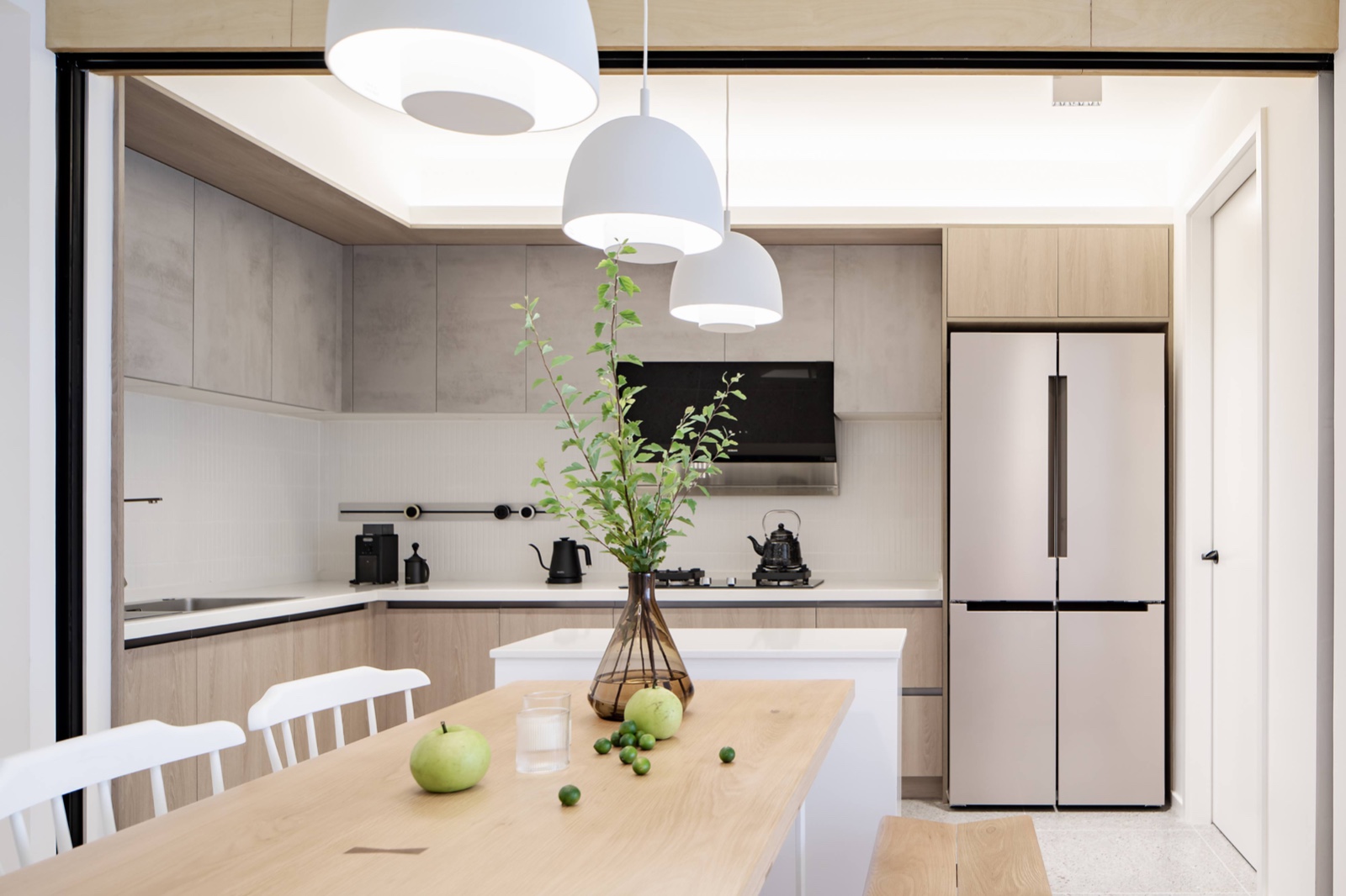 利用廚房空間做了一個餐邊柜與餐桌連接,增加操作臺面的同時,反向?qū)N房做敞開柜形式使用。