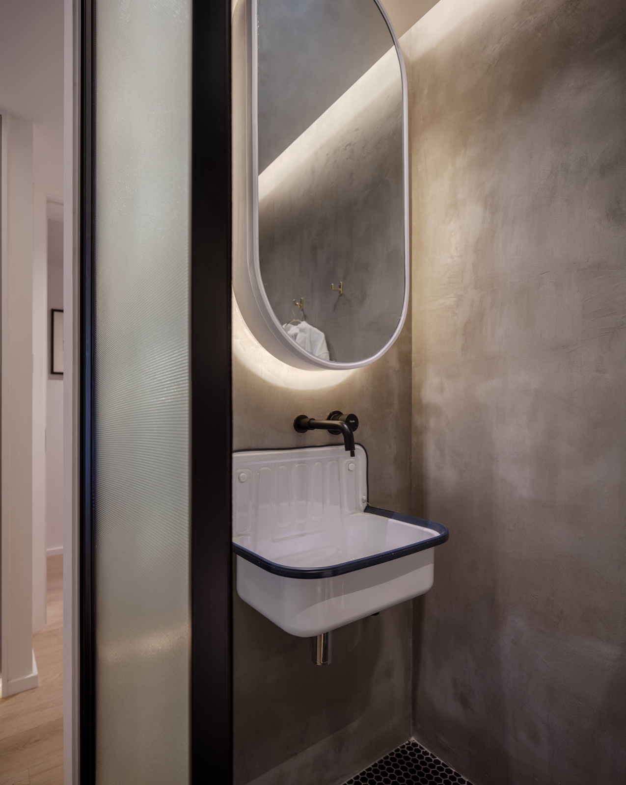 衛(wèi)生間臺盆柜是現(xiàn)場水泥現(xiàn)澆制作,在比較小的空間里現(xiàn)場制作利用率會更高;墻面小磚和縫隙線條讓原本緊促的空間顯出盈余的延伸感。