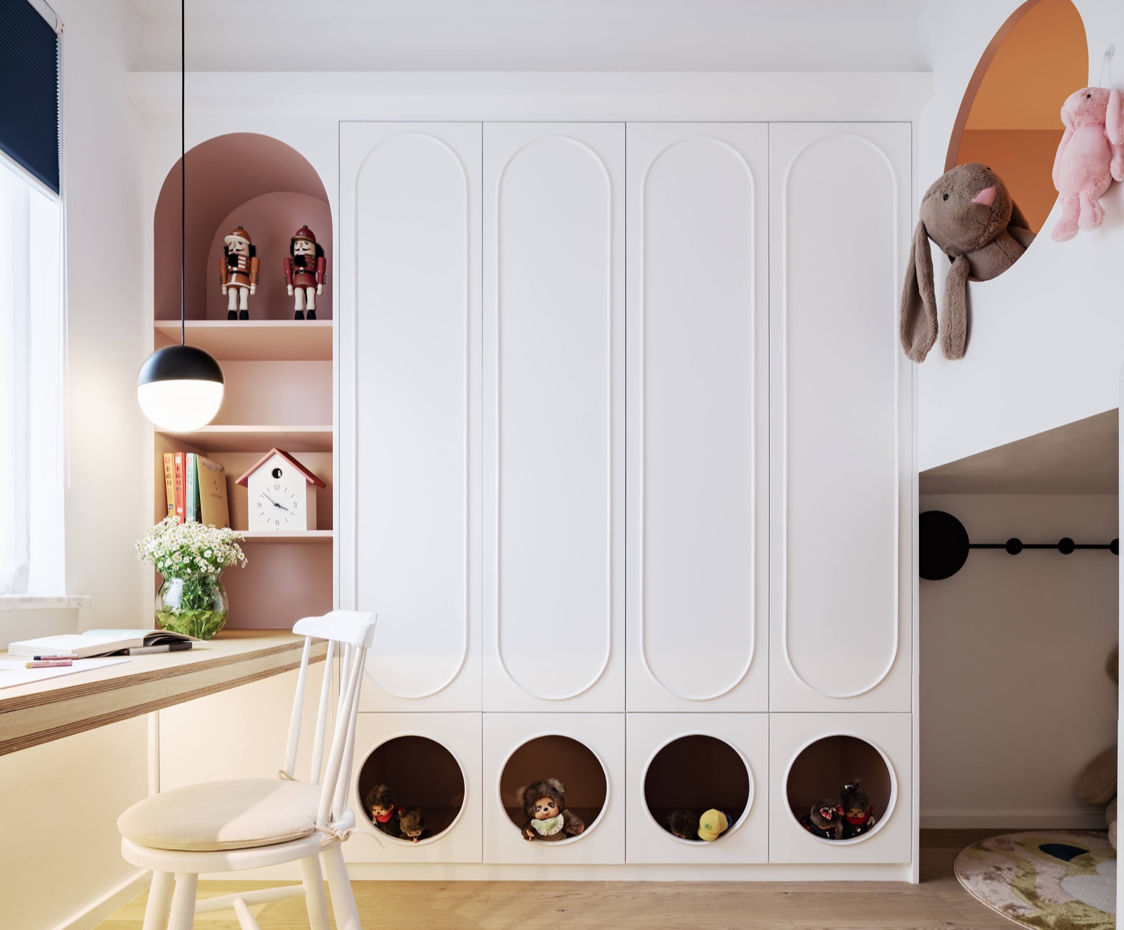 老人房的床采用地臺形式,在滿足使用功能的同時還可以充當(dāng)換季儲藏空間;床邊設(shè)計了邊柜,方便老人隨手拿放東西;地臺與衣柜底部預(yù)留了暗藏?zé)魩?,既增加空間層次也可作為起夜燈使用。