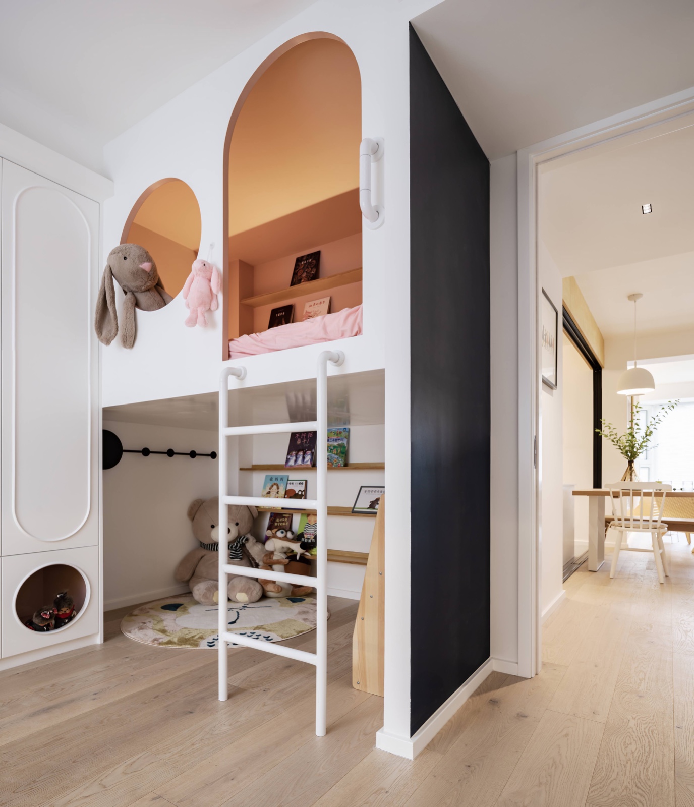 在相對有限的空間里,設(shè)計師希望把面積***化留給孩子活動,因此將床設(shè)置在空間上半部分,下半部分則留給孩子閱讀、娛樂、玩耍。