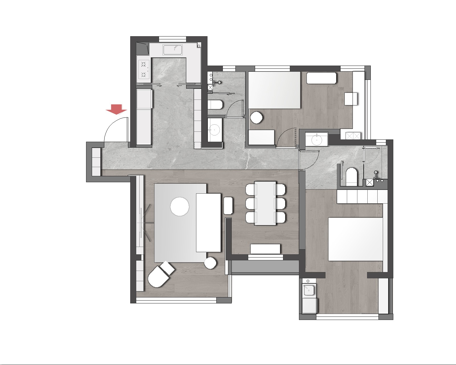 原始戶型客餐廳南北走向,布局優(yōu)化后在客餐廳形成了東西軸線方向,加強了客餐廳之間的聯(lián)系,為公共空間創(chuàng)造更好的互動性。空間重組之后增加了西廚區(qū)域,作為中廚的補充。將陽臺納入客廳的部分整體考慮,讓每個空間都得到了***的釋放,化解身與外物的隔閡,不下堂筵,坐窮泉壑。